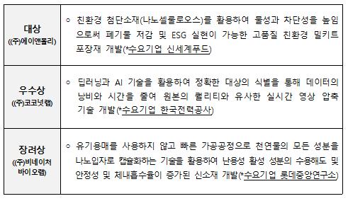 1탄 대상을 수상한 ‘(주)에이앤폴리’는 최근 화두인 ESG(환경·사회·지배구조개선) 경영 확산에 따른 친환경·생분해 밀키트 포장재에 목재에서 추출한 나노셀룰로오스 성분을 활용한 고기능, 생분해성 포장재 개발기술을 제시하여,