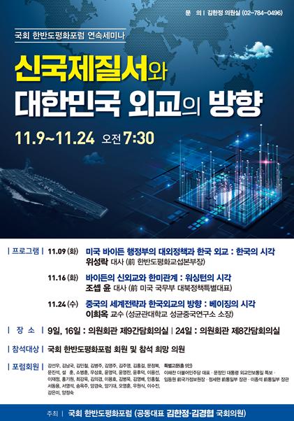 [한국연예축제일보, 허난세기자] 국회 한반도평화포럼(공동대표: 김한정, 김경협 의원)은 '신국제질서와 대한민국 외교의 방향'의 세 번째 세미나를 11월 24일 오전 7시 30분 국회의원회관 제8간담회의실에서 개최한다고 밝혔다.
