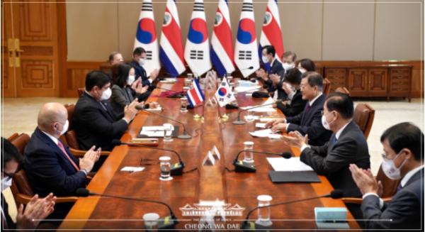 [한국연예축제일보, 김재만기자] 문재인 대통령은 23일 오전, 코스타리카 카를로스 알바라도 케사다 대통령과 함께한 한-코스타리카 정상회담에서 “양국 관계를 ‘행동지향적 포괄적 동반자 관계’로 격상한다”며 “친환경, 디지털, 과학기술, 인프라를 비롯한 다양한 분야에서 실질적이고 구체적인 성과를 기대한다”고 밝혔다.