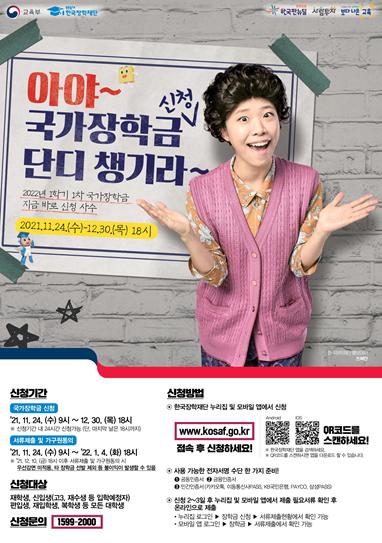 [한국연예축제일보, 유혜경기자] 교육부와 한국장학재단은 11월 24일 9시부터 12월 30일 18시까지 2022학년도 1학기 1차 국가장학금 신청을 받는다.