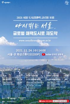 [한국연예축제일보, 임정선기자] 서울시가 '다시 뛰는 서울, 글로벌 매력도시로 재도약(Unleash Seoul’s Attractiveness)'을 주제로 한 「2021 서울 도시경쟁력 글로벌 포럼」을 오는 11월 24일(수) 14시부터 약 3시간 30분 동안 온라인으로 개최한다.