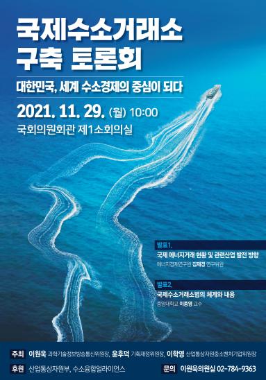 [한국연예축제일보, 허난세기자] 이원욱 국회 과학기술정보방송통신위원장(더불어민주당, 경기 화성을)은 윤후덕 기획재정위원회 위원장, 이학영 산업통상자원중소벤처기업위원장과 공동으로 29일 오전 10시 의원회관 제1소회의실에서 ‘국제수소거래소 구축 토론회’를 개최한다. 산업부와 수소융합얼라이언스는 후원으로 참여한다.