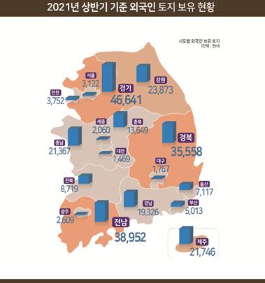 [한국연예축제일보, 이왕신기자] 국토교통부는 ‘21년 상반기 기준 외국인이 보유한 국내 토지면적은 256.7㎢(2억 5,674만㎡)으로, 전 국토면적(100,413㎢)의 0.26% 수준이라고 밝혔다.