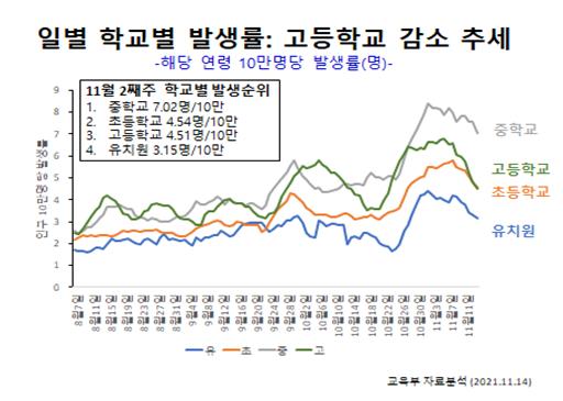 이날 참석한 전문가인 서울대학교 최은화 교수의 분석에 따르면 2021년 11월 현재, 학생 코로나 발생률은 전년도에 비해 증가하였으며, 특히 최근 4주간(40~43주) 소아청소년 10만 명당 확진자는 99.7명으로 19세 이상 성인을 초과한 것으로 나타났고, 최근 1주일(43주) 내에서도 소아청소년 확진 추세가 더 높은 것으로 확인됐다.