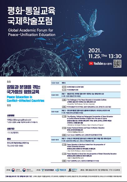 ‘갈등과 분쟁을 겪는 국가들의 평화 교육’을 주제로 열리는 이번 포럼은 국내와 이스라엘, 사이프러스, 북아일랜드 등 해외의 평화학자들이 참여하여, 각국의 갈등 극복과 평화 교육의 경험을 공유하고, 한반도와 세계의 평화 교육 방향을 함께 논의할 예정이다.
