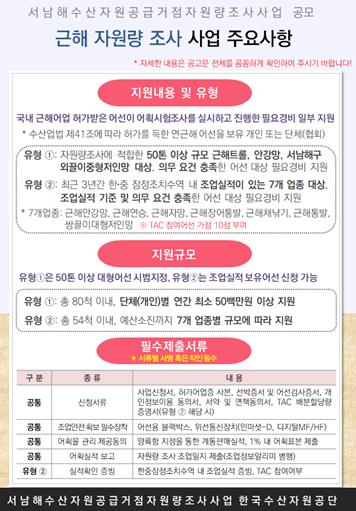 서남해 수산자원 공급거점 자원조사 사업은 국내 최초로 추진되는 사업으로, 수산자원의 불모지로 평가되는 한·중잠정조치수역, 현행유지조업수역 등 서해역 대체어장 개발로 공간적 확장 및 어업 생산량 증대 도모를 위해 추진되는 사업이다.