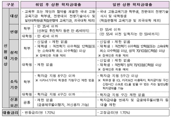 ② (취업 후 상환 학자금대출 지원대상 확대) 취업 후 상환 학자금대출(ICL) 지원 범위를 학자금지원 4구간 이하 일반대학원의 석·박사 과정 또는 전문대의 전문기술석사학위 과정을 이수중인 자(대학원생은 성적 및 이수학점 요건 미적용)까지 확대하고,학부생은 성적요건(기존 C학점)에 상관없이 직전 이수학점 12학점(또는 소속대학 최소 이수학점) 이상만 충족하면 대출이 가능하다.