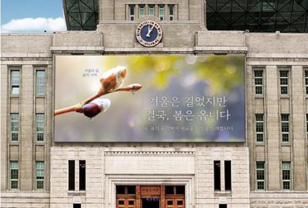 [한국연예축제일보, 임정선기자] 2월 7일 오전, 서울시가 새해 첫 서울꿈새김판(이하 꿈새김판)을 공개했다. ‘겨울은 길었지만 결국, 봄은 옵니다’라는 문구와 함께 여린 나뭇가지 끝에 맺힌 겨울눈이 눈에 띈다. 겨울의 끝과 봄의 시작을 알리는 겨울눈에 희망의 메시지를 담았다.
