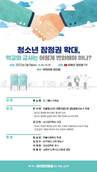 [한국연예축제일보, 허난세기자] 강민정 의원(더불어민주당, 교육위원회)은 오는 2월 9일 오후 4시부터 ‘청소년 참정권 확대, 학교와 교사는 어떻게 변화해야 하나?’ 토론회를 개최한다. 이번 토론회는 코로나19에 따른 거리두기 준수 및 열린 시민 참여를 위해 유튜브 ‘강민정TV’에서 생중계하는 온라인 토론회로 진행된다.