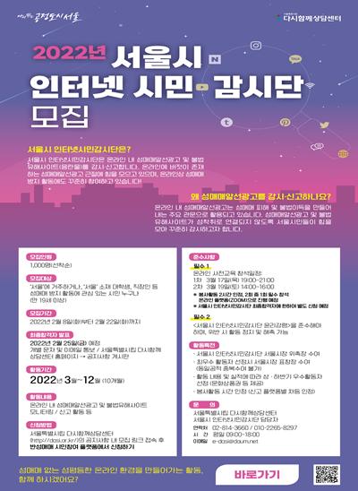 ‘서울시 인터넷 시민감시단’은 서울시가 불법 성산업을 근절하기 위해 2011년 발족한 시민참여 온라인 모니터링단이다. 감시단은 온라인상의 불법?유해 정보를 집중 감시해 성매매 유인 환경 차단과 관련자에 대한 처벌과 단속에 기여하고 있다.