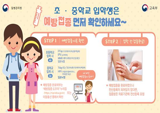 [한국연예축제일보, 한진우기자] 질병관리청과 교육부는 학생들의 감염병 예방과 건강 보호를 위해 초?중학교 입학 전 필수예방접종(초등학교 4종, 중학교 3종)을 완료하도록 권고했다.