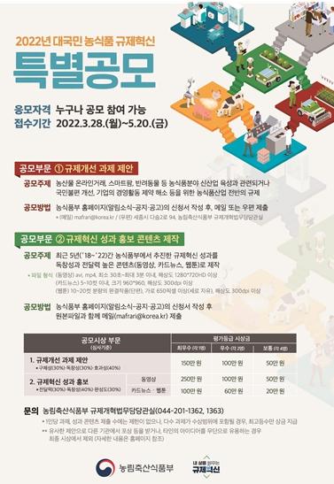 [한국연예축제일보, 이왕신기자] 농림축산식품부는 수요자 및 현장 중심의 규제개선으로 국민 체감도를 높이기 위해 3월 28일부터 5월 20일까지 '2022년 농식품 분야 규제혁신 특별공모'를 개최한다.