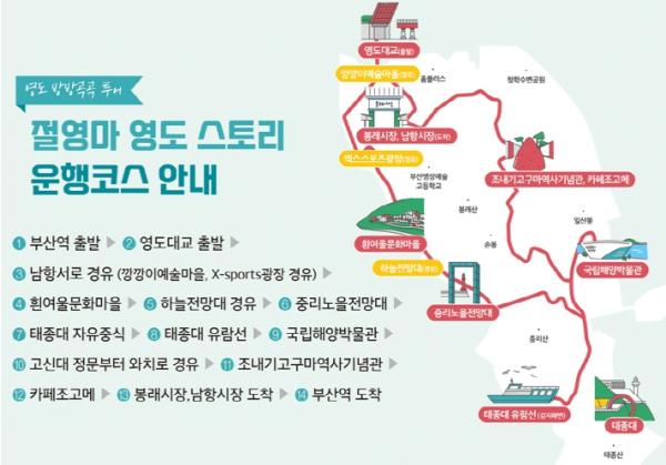 영도의 특징과 캐릭터를 담은 차량으로 즐기는‘절영마 영도 스토리 투어버스’는 관광지외에도 영도구 내 식당이나 카페를 이용하도록 구성되어 있어 지역 상권 활성화와 함께 실속 있는 투어 상품으로 관광객의 수요에 부응할 것으로 기대하고 있다.
