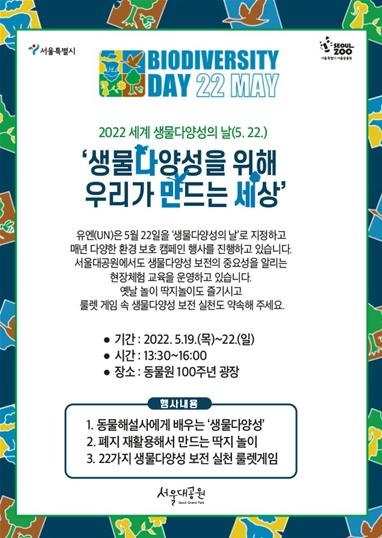 [한국연예축제일보, 임정선기자] 서울대공원은 ‘생물다양성의 날(5.22.)’을 맞아 어린이들이 자연 속에서 놀이를 통해 생물의 다양성 보존의 중요성을 배우는 '생물다양성을 위해 우리가 만드는 세상!'현장 교육 프로그램을 운영한다. 5월 19일~22일 오후 1시 30분부터 4시까지 동물원 100주년 기념 광장에서 진행된다.