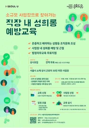서울시는 서울시 전체 사업장의 97.8%를 차지하지만 법적?제도적 성희롱 예방체계가 취약한 30인 미만 소규모 사업장을 대상으로, 법정의무교육인 성희롱 예방교육은 물론 컨설팅, 사건발생 시 조사 및 심의까지 무료로 지원한다고 밝혔다.
