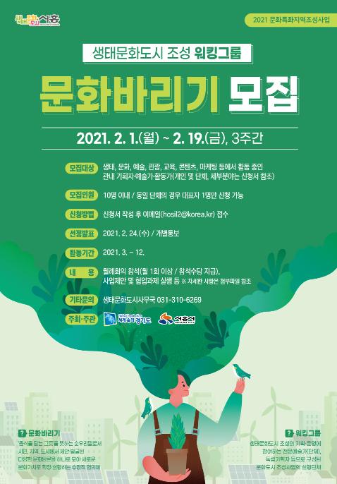 한편, 생태문화도시 조성 워킹그룹 '문화바리기' 모집분야는 생태, 기후, 환경, 축제·문화기획, 공간·지역재생, 관광, 홍보, 지역음식, 디자인, 마케팅, 교육, 토론, 콘텐츠 등 문화와 관련된 일체 모집하며 신청자격은 관내 문화예술 활동 단체 및 개인이다. 자세한 내용은 시흥시청 홈페이지에서 확인 가능하며 신청은 이메일로 접수 가능하다. 기타 문의사항은 생태문화도시사무국(031-310-6269)으로 하면 된다.