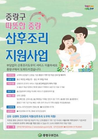 지원대상은 신청일 기준 중랑구에 1년 이상 거주한 산모 또는 배우자로, 출산예정일 40일 전부터 출산 후 30일까지 신청가능하다. 평균 본인부담 금액은 3만~14만 원 정도로 저렴하다. 예를 들어 10일 동안 서비스 비용 중 52만 원 상당의 본인부담금이 발생했다면, 총 비용 중 구가 지원하는 90%를 제외한 5만 2천원만 신청자가 부담하면 된다.