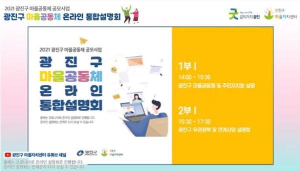 더불어 구는 주민들이 원활하게 사업에 참여할 수 있도록 접수 전 광진구 마을자치센터를 통해 서류 작성과 접수방법 등에 대한 사전 컨설팅을 지원하며, 광진구 마을공동체 공식 유튜브를 통해 온라인 설명회 영상도 제공한다.