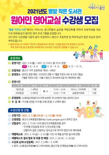 [한국연예축제일보, 유혜경기자] 서울 용산구가 3월 8일~12월 15일 3기(기수별 26회)에 걸쳐 별밭 작은도서관(대사관로34길 49, 제천회관 4층) 원어민 영어교실을 운영한다.