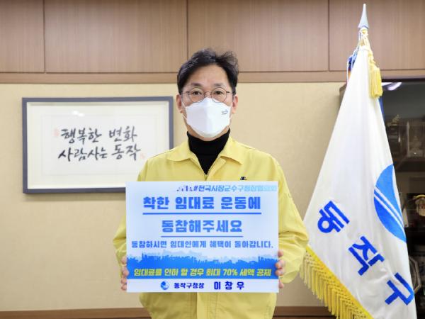 이창우 동작구청장은 “임대인 여러분의 동참이 소상공인 자영업자에게 큰 힘이 됩니다. 경제위기 극복을 위해 동작구도 함께 하겠습니다”라며, “코로나19 위기를 극복할 수 있도록 임대인의 많은 참여 부탁드린다”고 메시지를 전달했다.