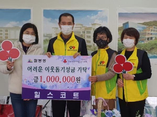 [한국연예축제일보, 유혜경기자] 익산시 팔봉동 ㈜ 힐스코트는 29일 복지사각지대 긴급 위기구호 지원에 써달라며 이웃돕기 성금 100만원을 지역사회보장협의체에 쾌척했다.