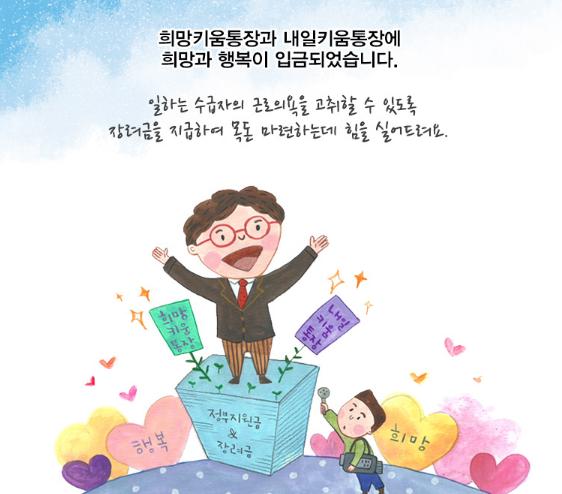 내일키움통장은 자활근로사업단에 월 근무일수 12일 이상 참여자가 대상이며, 3년 동안 매월 5만원?만원?만원을 저축하면 내일근로장려금(본인 저축액 1대1) 및 내일키움장려금(1대1, 1대0.5), 내일키움수익금(월 최대 15만원)을 합친 최대 2340만원을 지원한다.