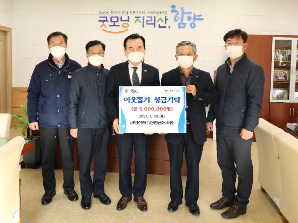 [한국연예축제일보, 유혜경기자] 함양군은 28일 함양산청축협 박종호 조합장 등 3명이 함양군청을 방문해 설 명절을 맞아 이웃돕기 성금 500만원을 기탁했다고 밝혔다.