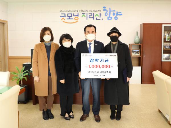(사)함양군장학회는 한국부인회 함양군지회로부터 29일 지역의 학생들을 위한 마음이 담긴 장학금 100만원을 기탁받았다고 전하였다.