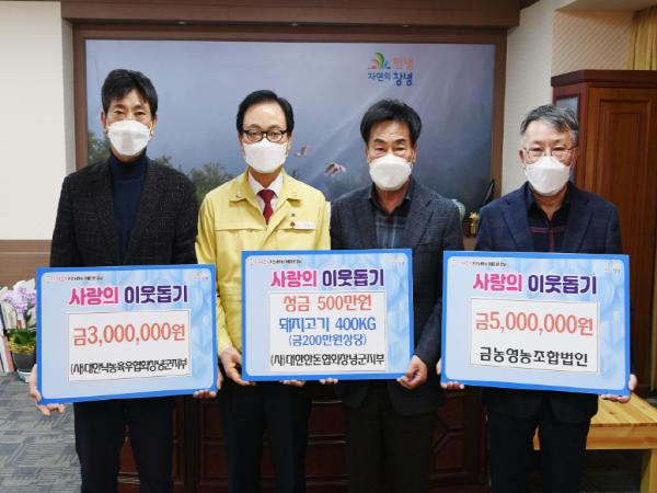 [한국연예축제일보, 유혜경기자] 창녕축협, ㈔대한한돈협회 창녕군지부, ㈔한국낙농육우협회 창녕군지부 및 금농영농조합법인(대표 조명제)은 지난 28일 민족 고유의 명절인 2021년 설을 맞이하여 각각 쇠고기(국거리용) 220㎏(1,000만원 상당), 성금 500만원 및 돼지고기(앞다리살) 400㎏(200만원 상당), 성금 300만원, 성금 500만원을 어려운 이웃에게 전달했다.