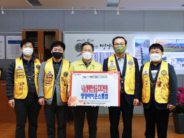 [한국연예축제일보, 유혜경기자] 국제라이온스협회 356-E지구 영양라이온스클럽(회장 이종열)은 1월 29일 영양군청을 방문하여 230만원의 성금을 전달하며‘희망2021 나눔캠페인’에 동참하였다.