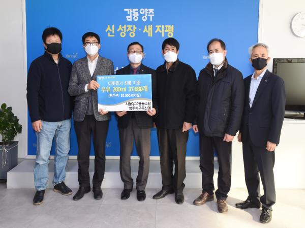 [한국연예축제일보, 유혜경기자] 양주시는 지난 28일 서울우유협동조합과 서울우유양주지구축산계에서 양주시청을 찾아 관내 소외되고 어려운 이웃을 돕는데 써달라며 멸균우유 37,680개(환가액 2,000만원)를 기탁했다고 밝혔다.
