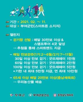 군은 올해도 부여군민의 걷기운동 실천을 장려하기 위해 ▲매일만보 걷기 챌린지(연속 30일, 60일, 100일 이상 연속 걷기) 달성 시 연 최대 10만원 상당의 굿뜨래페이 지급 ▲걷쥬왕 스탬프 투어 달성 시 매월 추첨을 통해 스마트밴드를 지급하는 챌린지를 진행할 예정이다.