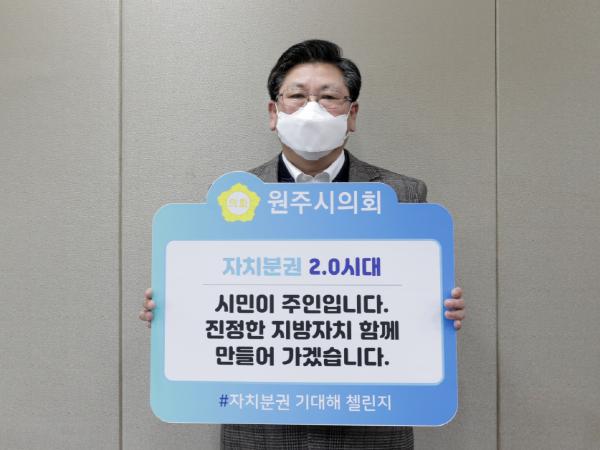 [한국연예축제일보, 변현식기자] 원주시의회 이성규 부의장은 자치분권을 향한 원주시의회의 오랜 염원을 담아 29일 ‘자치분권 기대해’ 챌린지 캠페인에 동참했다.