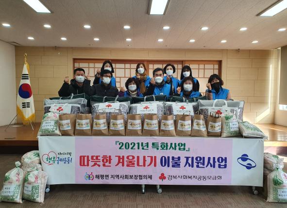 이번 행사는 임원진의 사전 회의를 거쳐 경북사회복지공동모금회 배분 및 해평면지역사회보장협의체 재원으로 이불 10채와 떡국 떡 20kg을 마련하였으며 지역주민이 기부한 쌀10kg 10포가 더해져 겨울 추위에 취약한 독거 어르신들, 취약계층에게 따뜻한 위로가 되었다.