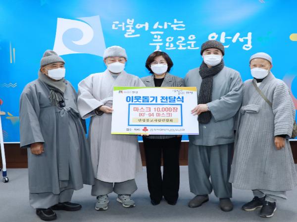 [한국연예축제일보, 유혜경기자] 안성사암연합회에서는 지난 28일 코로나 19에 취약한 저소득층 지원을 위한 마스크(KF94) 10,000매를 안성시에 기증했다.