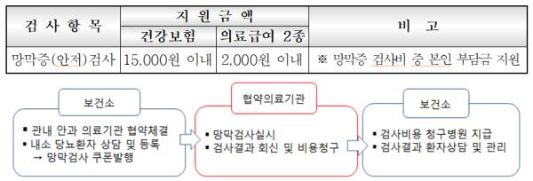 당뇨망막증 검사비 지원 대상은 관내 주소지를 둔 만 30세 이상의 당뇨환자로, 보건소 2층 통합건강관리실에서 상담 후 검사비 지원 쿠폰을 발급 받을 수 있는데 지원내용 및 절차는 아래와 같다.