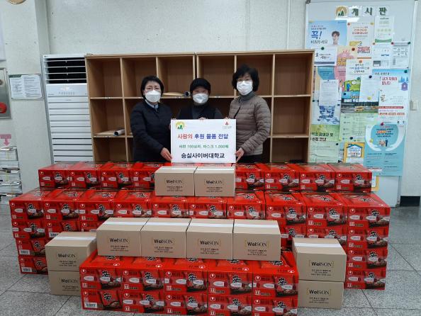 숭실사이버대학교 총학생회 대표는 “지난 1년 동안 코로나19로 경기가 침체되고 기부 문화가 위축된 상황에서 형편이 어려운 가정에 조금이나마 도움을 주고자 학생들의 뜻을 모아 기부 문화에 동참하게 됐다”며 “우리 이웃들이 힘을 내고 서로 도와 코로나19 위기를 함께 극복했으면 좋겠다”고 말했다.