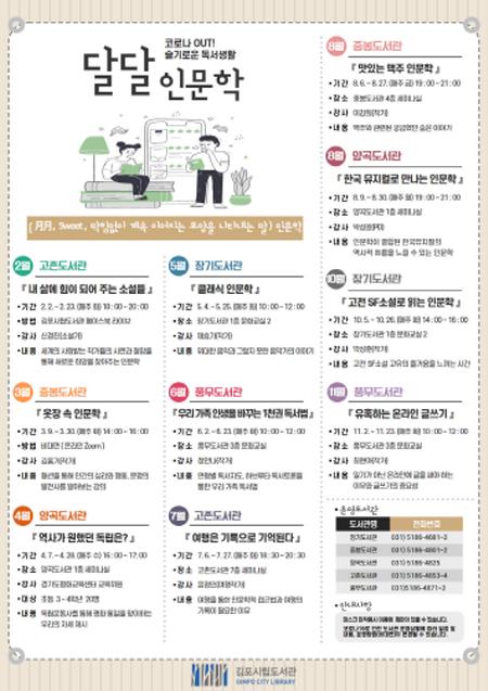 [한국연예축제일보, 이순례기자] 김포시립도서관은 장기화된 코로나-19로 지친 시민들에게 위안이 되고자 공공도서관 6개관에서 2월부터 11월까지 10회에 걸쳐 「달달 인문학」을 개최한다.