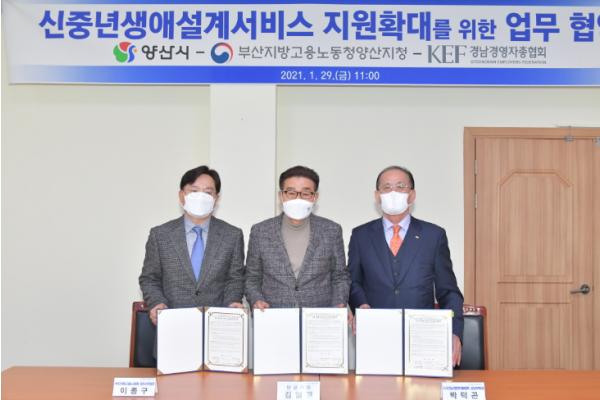 [한국연예축제일보, 유혜경기자] 양산시는 부산지방고용노동청양산지청, 경남경영자총협회와 양산지역 신중년 생애설계서비스 지원 확대를 위한 업무협약을 29일 체결했다.