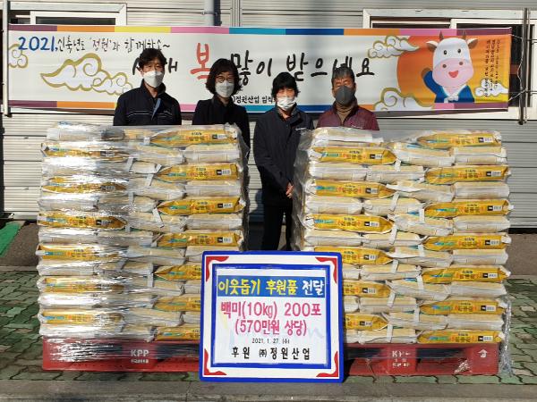 ㈜정원산업은 2014년부터 현재까지 매년 설명절마다 백미(20㎏) 100포씩을 기탁해오고 있었으며, 올해는 더 많은 돌봄이웃에게 나눔을 베풀고자 10㎏짜리 백미를 200포씩이나 마련하여 기탁하게 되었다. 뿐만 아니라 평소에도 어려운 이웃을 위해 봉사하며 나눔을 실천하고 있고, 몇 년전 공장을 이전할 때에는 축하 화환 대신 쌀을 받아 전부 기부한 일화가 있을 정도로 적극적인 이웃사랑을 실천하는 기업으로 귀감이 되고 있다.