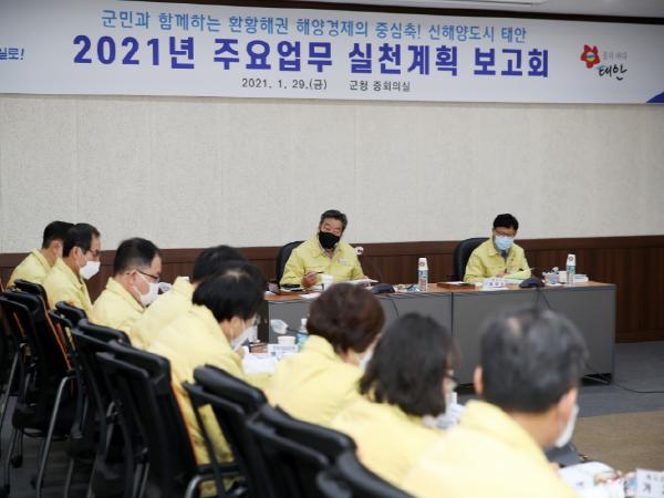 군은 지난 29일 군청 중회의실에서 가세로 태안군수를 비롯한 각 부서장 및 군정자문교수 등이 모인 가운데, 올 한 해의 군정 주요시책을 비롯해 태안의 미래발전을 견인할 각 부서별 중점 추진 사업 실천계획을 보고하는 ?년 주요업무 실천계획 보고회’가 개최됐다.