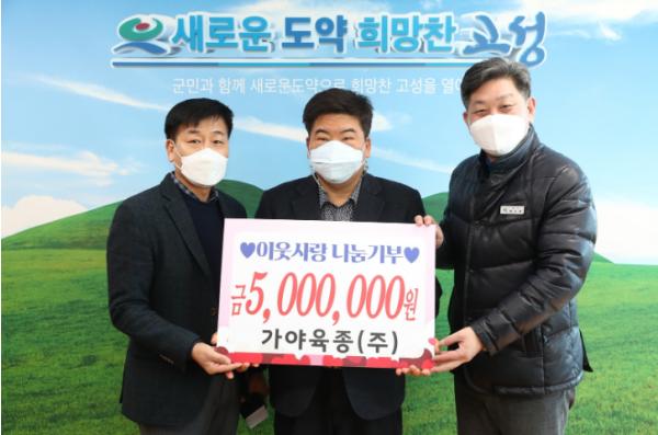 가야육종(주)(대표 이재식)은 1월 29일 고성군청을 방문하여 어려운 이웃을 위해 성금 500만 원을 전달했다.