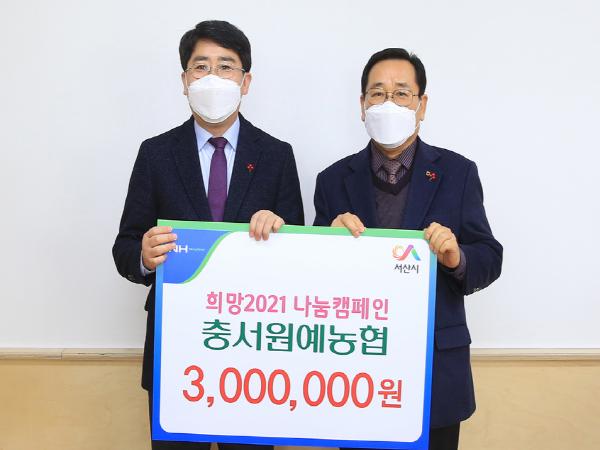충서원예농협(조합장 이종목)이 29일 서산시를 방문해 이웃돕기 성금 300만원을 기탁했다.