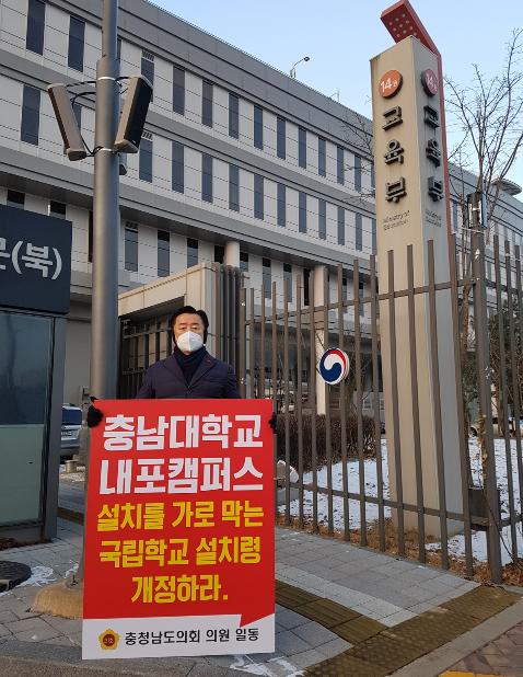 이 의원은 29일 세종시에 위치한 교육부 정문 앞에서 충남대 내포캠퍼스 유치를 위한 국립학교 설치령 개정 1인 시위를 하고, 교육부 고등교육정책관과 만나 면담을 가졌다.
