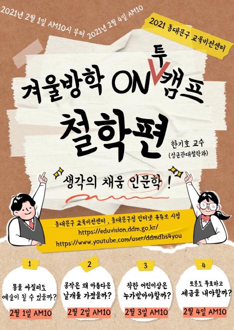 [한국연예축제일보, 유혜경기자] 동대문구는 겨울방학을 맞이하여 학생들이 미래인재 역량을 키울 수 있도록 ‘겨울방학 ONⅡ캠프『생각의 채움 인문학』’을 2월 1일부터 온라인에서 운영한다고 밝혔다.