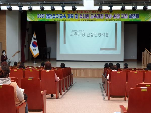 [한국연예축제일보, 서병진기자] 경상북도김천교육지원청은 2021년 1월 28일 학생문화예술센터에서 관내 공?사립유치원 교원 40명을 대상으로‘놀이로 세상을 배우는 2021 김천유아교육 계획 설명회’를 개최했다고 밝혔다.