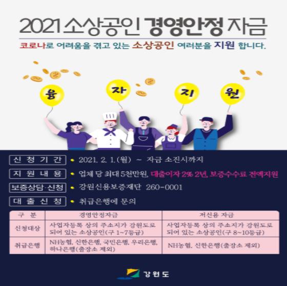 이와 함께, 강원도는 2020년부터 시중은행 문턱이 높아 고금리 대출을 이용하는 저신용(구 신용등급 8~10) 소상공인을 위해 저신용 전용자금을 운영하고 있다.