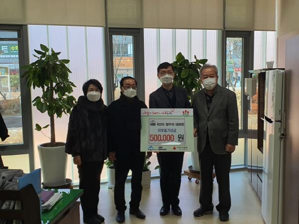 이번 기부금은 새뜸마을4단지 입주자 대표회와 통장이 코로나19 장기화로 어려움을 겪는 취약계층을 돕기 위해 자발적으로 모아 마련했다.
