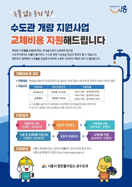 시흥시(맑은물사업소 상수도과)에서는 지난 6년간 총 4,437세대를 대상으로 약 25억원의 사업비를 지원해 수도관을 개량하고, 안전한 물 공급에 노력을 기울여 왔다. 2021년 수도관 개량 지원 사업비는 약 6억 원으로 1,610세대를 지원할 계획이다.