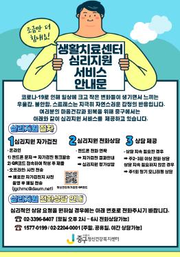 이외에도 코로나19로 마음이 지친 중구민과 자가격리자에게도 심리 상담, 심리지원 물품 제공 등 불안감과 스트레스를 해소할 수 있도록 힘쓰고 있다.